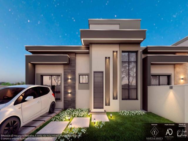 - 3 dormitórios (1 suíte), banheiro social, sala, lavanderia, garagem descoberta, e passagem lateral.